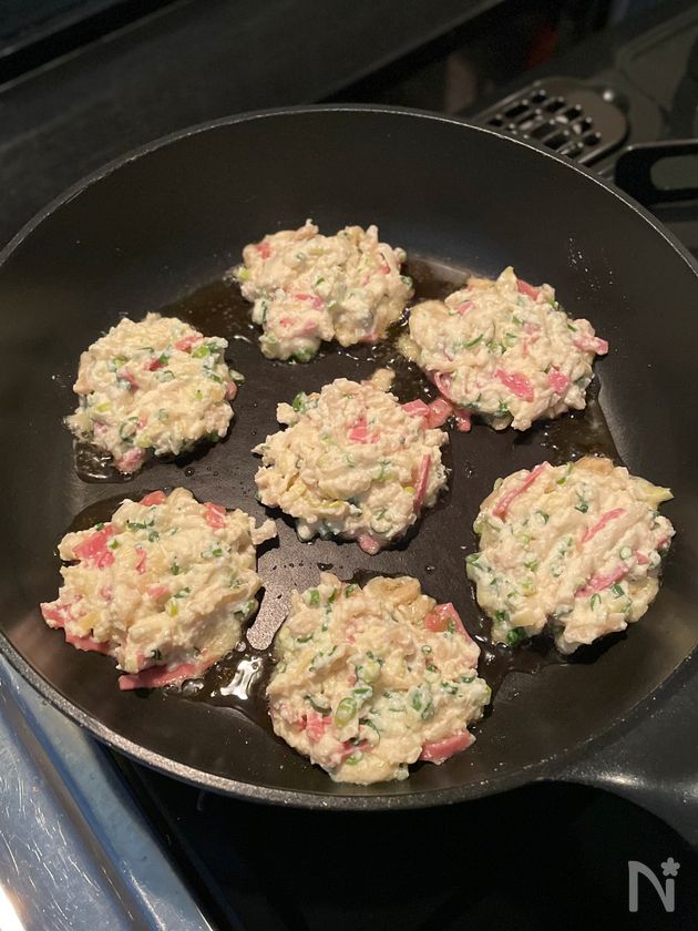(3) フライパンでごま油を中火で熱し、②をスプーンですくい落とし並べる。カリッと焼き色がついたら裏返し、同様に焼く。器に盛り、お好みでポン酢を添える。