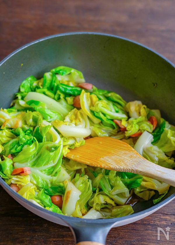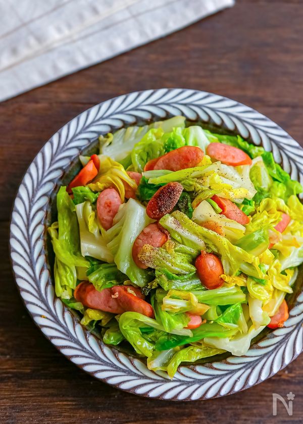 春きゃべつとウインナーのガリバタコンソメ炒め
