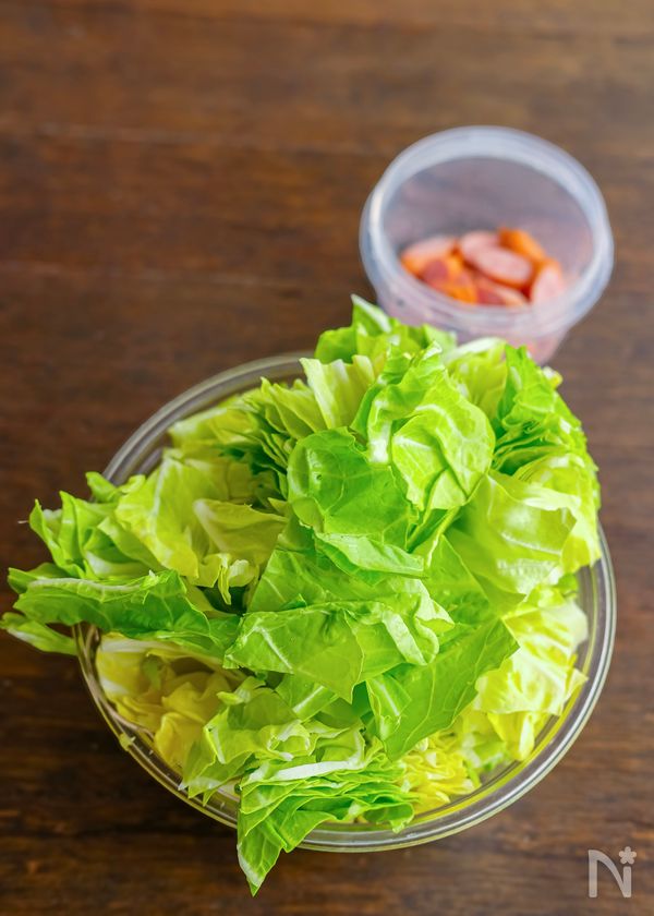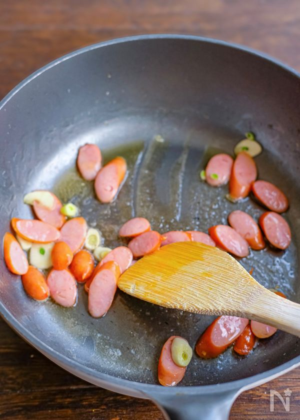 (1) 春きゃべつはざく切りに、ウインナーは斜め切りに、にんにくは薄切りにする。