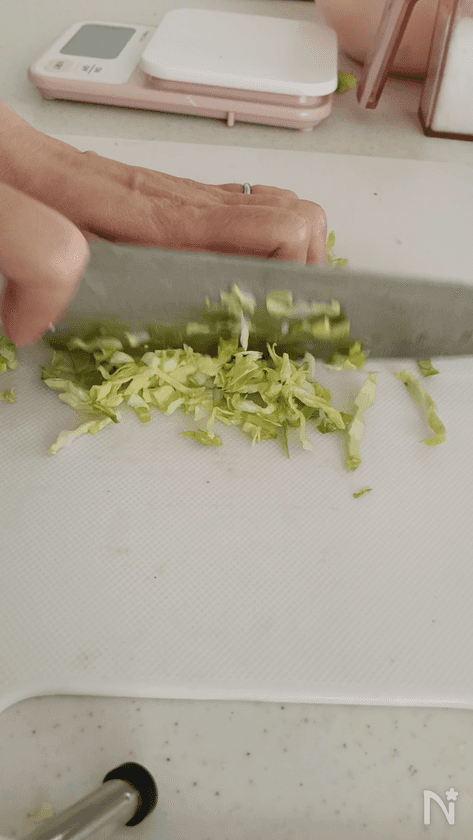 肉だねに、よく絞って水気を除いたキャベツ、にらを加えて全体が均一になるように混ぜる。