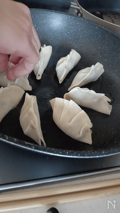 (7) フライパンんに油を広げて熱し、餃子をくっつかないように並べ、底に焼き色が付くまで焼く。