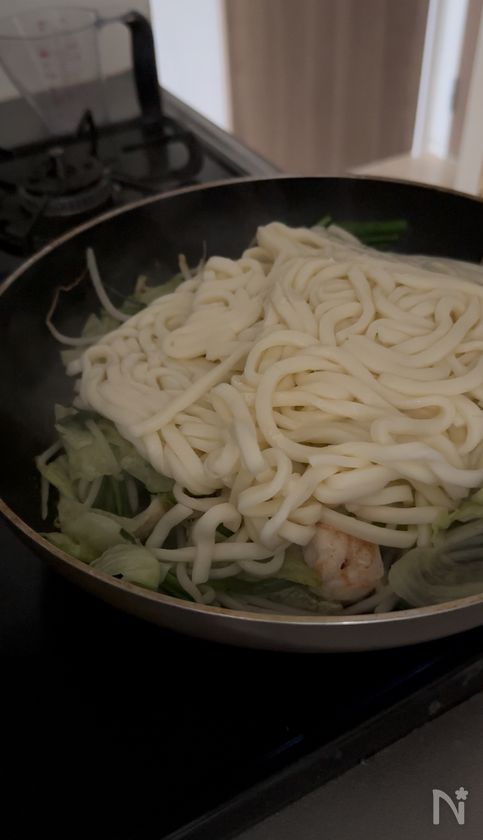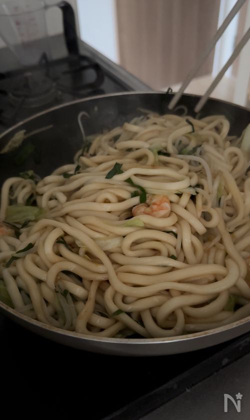 (2) エビに火が通ったら、ゆでうどん、【A】を加えて炒め合わせる。