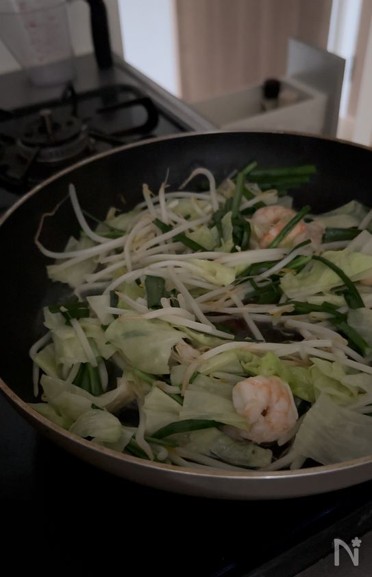 (1) フライパンにごま油をひき、にんにく、剥きエビ、キャベツ、ニラ、もやしを弱めの中火で炒める。