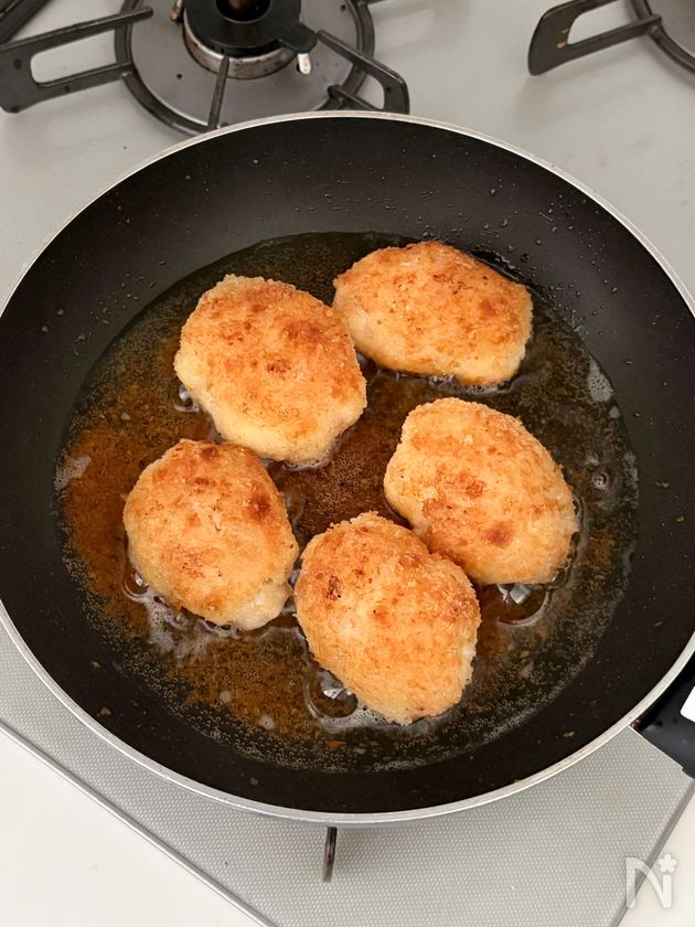 (4) フライパンにサラダ油を2cmの高さまで注ぎ、温度を170℃まで上げたら、③を入れ、衣が色づくまで揚げる。