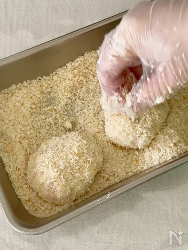 ・つなぎがないので、パン粉をつける際は、手でぎゅっぎゅっと握るようにしてつけてください。