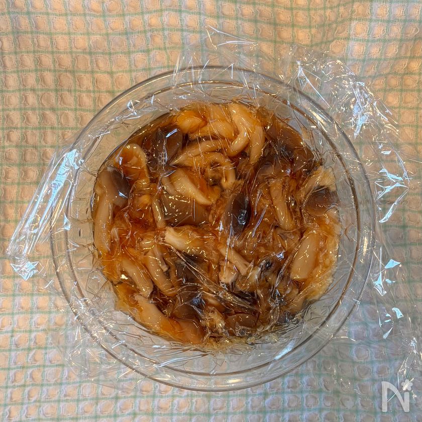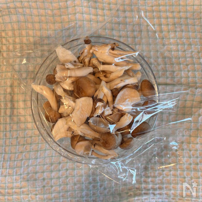 しめじをレンチンした後の水分をよく拭き取ることで、きのこ独特の青臭さを軽減できます♪