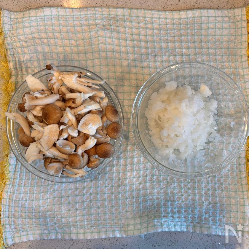 (1) しめじをボウルに入れて塩ひとつまみを馴染ませる。
