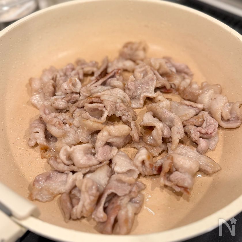 (2) 中火に熱したフライパンにごま油をひき、片栗粉をまぶした豚肉を加えてこんがり焼き色がつくまで焼く。