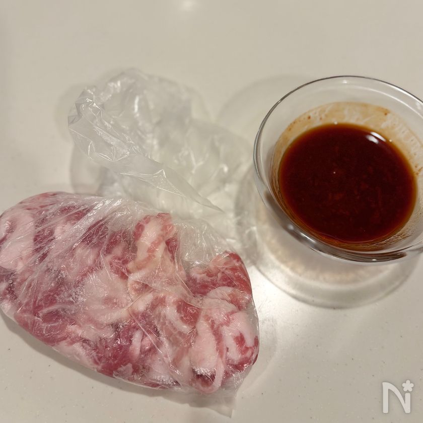 (1) 豚バラ薄切り肉を食べやすい大きさに切る。ポリ袋に豚肉と【A】を入れて混ぜ合わせる。