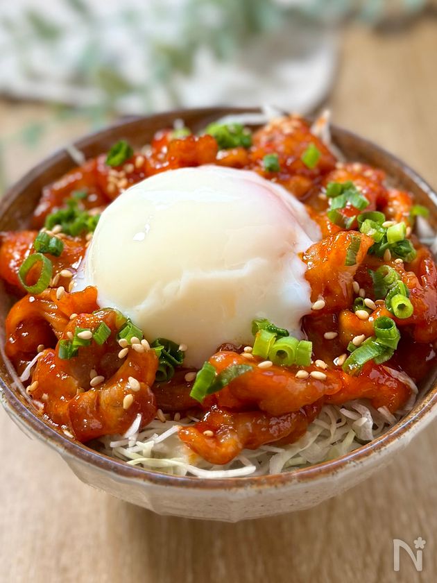 (4) 器に温かいごはんと千切りキャベツを盛り、3をのせ真ん中に温泉卵をおとす。