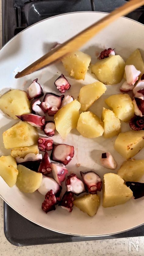 (4) じゃがいもを加えて軽く焼き色がつくまで炒め、タコを加えてさっと炒める。