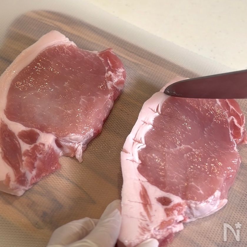(1) 豚ロース肉(とんかつ用)をフォークで両面に穴をあける。