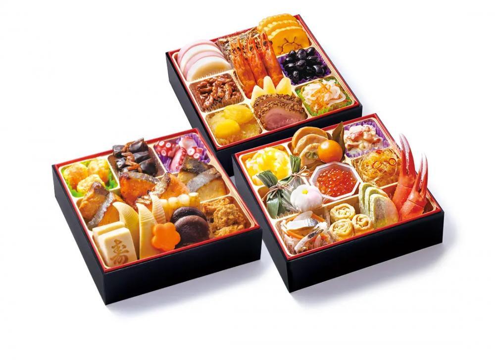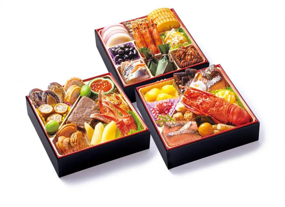 全32品を詰め込んだ「プレミアム三段重」は、イセエビや黒毛和牛ローストビーフ、本ズワイ蟹爪幽庵など、高級素材を惜しみなく使った贅沢おせちです。