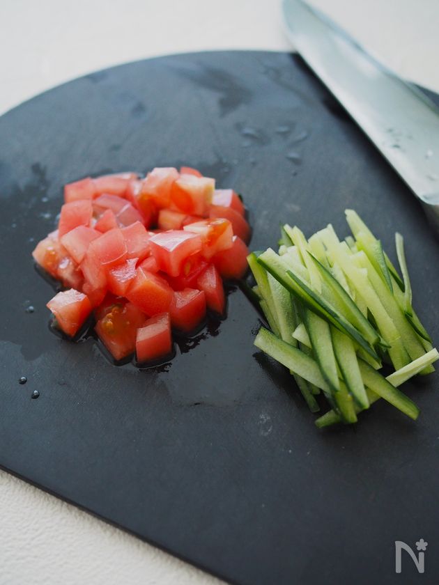 (4) きゅうりはせん切り、トマトは角切りにする。