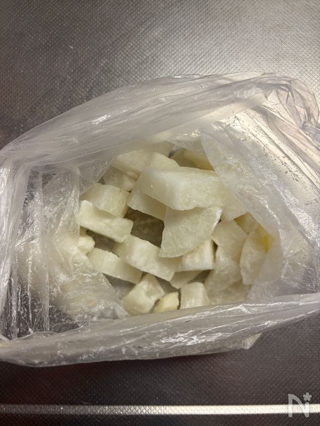 ポリ袋に入れて→ 600Wで7〜8分レンチン