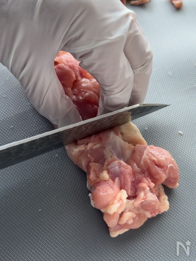 🔶鶏もも肉の厚い部分に切り込みを入れてフォークでまんべんなく穴を開けることで中まで火が通りやすくなりますよ