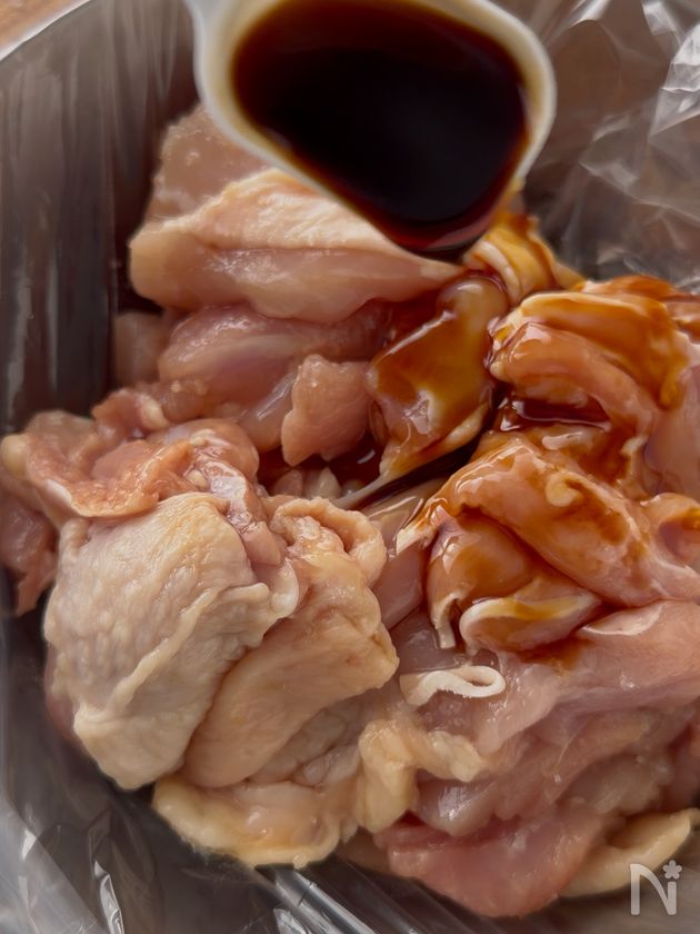(1) ポリ袋に鶏もも肉と【A】を入れて揉みこみ10分置く。