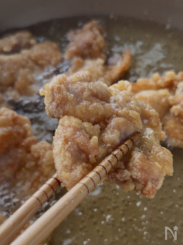 鶏肉を休ませている間に低温→高温でカリッと揚げる