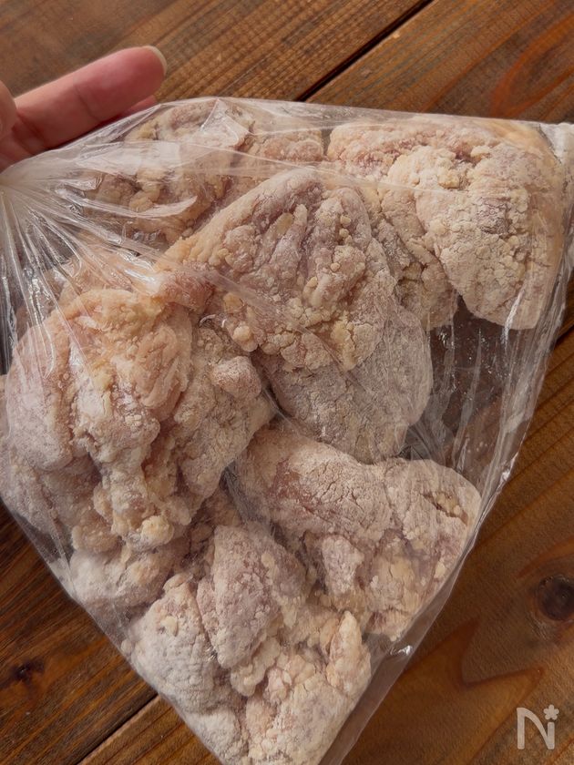 (2) ①に片栗粉を加えて振る。片栗粉(2度付け用)を加えてしっかり衣をつける。