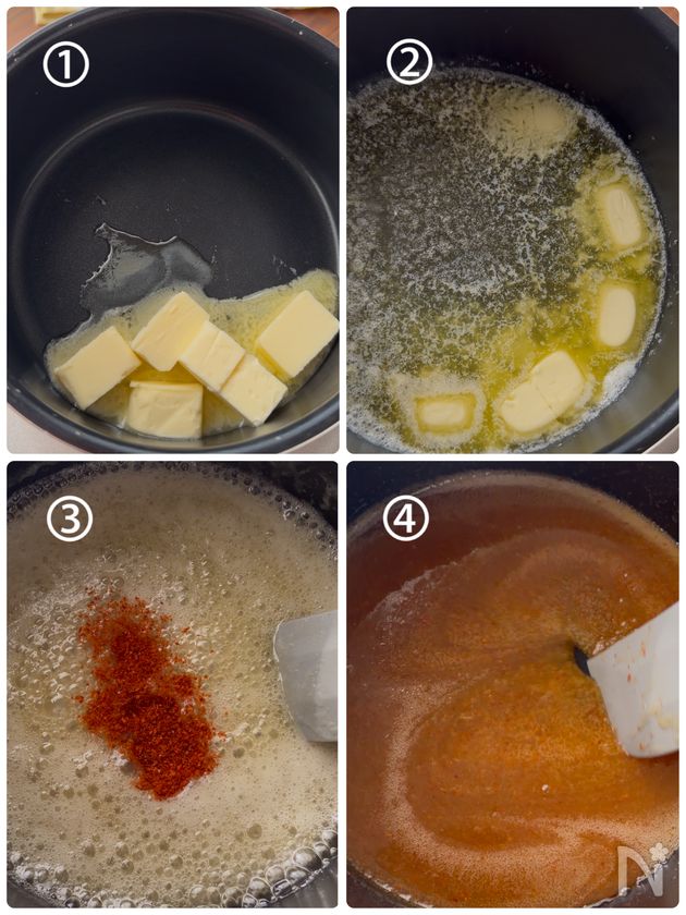 🔶ホットハニーバターソースは焦げやすいので弱火で煮詰めて下さい。とろみがつくまで煮詰めて少し少しキャラメルの風味も楽しめるソースにしています。溶かすだけで大丈夫な場合はレンジでバターを溶かしてはちみつと一味唐辛子を加えて混ぜて作って頂いても◎