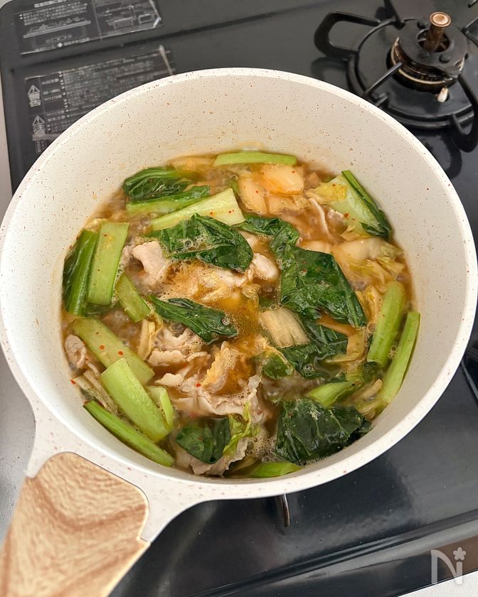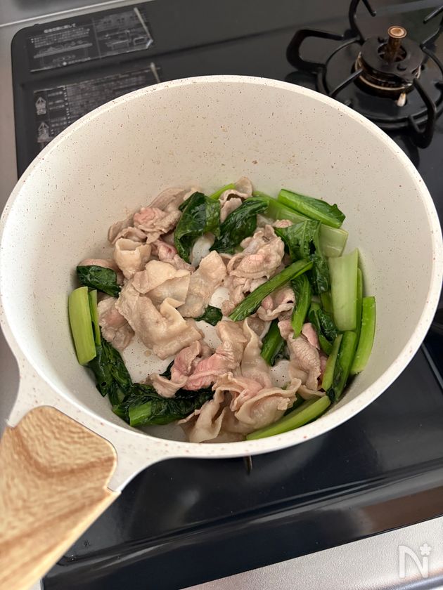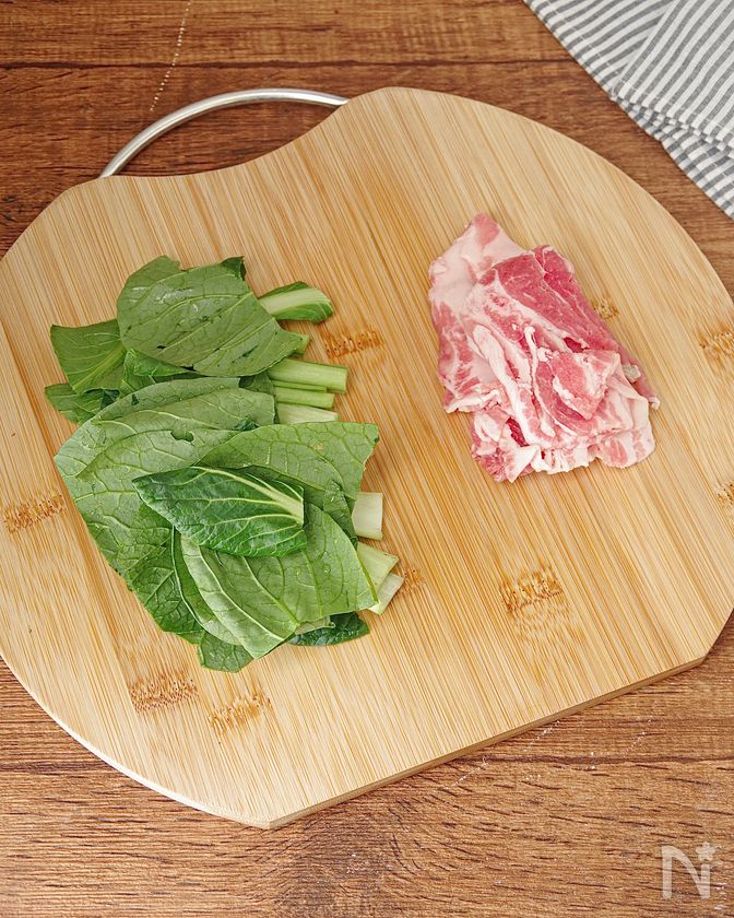 (1) 豚バラ薄切り肉は食べやすい大きさに切る。小松菜は3cm幅に切る。
