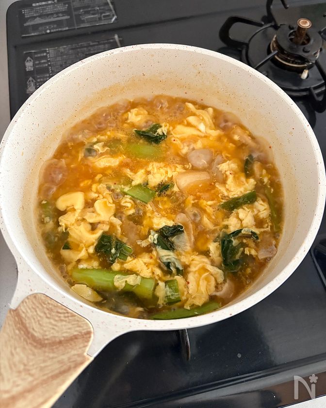 【工程④】卵はスープを煮立たせた状態で回し入れてください。