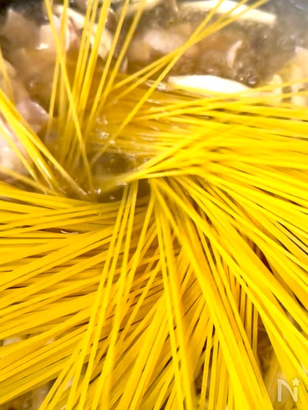 (2) 沸騰したらパスタ(7分茹で)を加える。