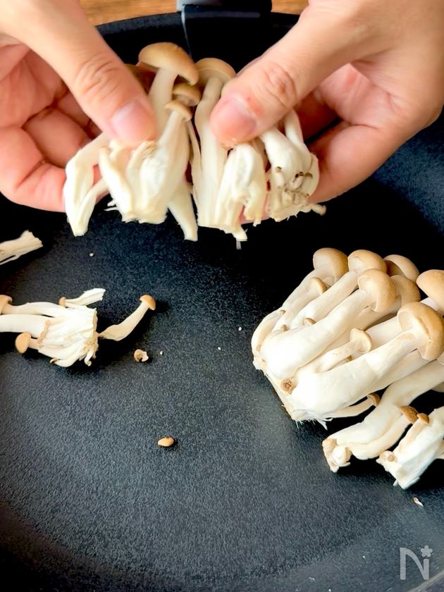 (下準備) しめじは石づきを切ってほぐし、ハーフベーコンは1cm幅に切る。