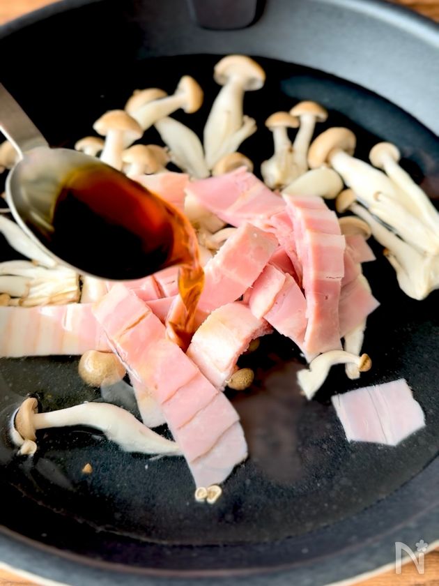 (1) フライパンにしめじ、ハーフベーコンと【A】を入れる。
