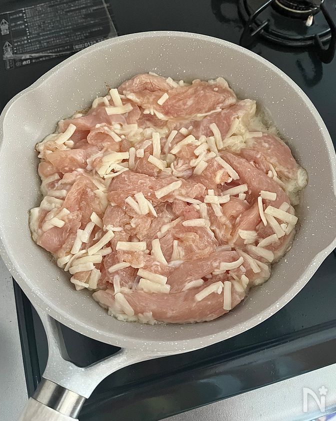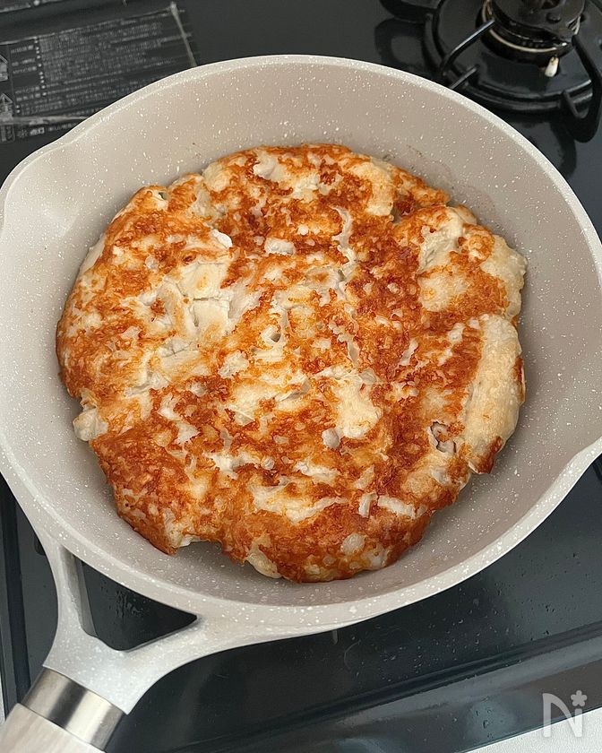 ・鶏むね肉の量が多かったり、片栗粉やチーズの量が少ないと裏返せず、崩れる原因になります。レシピ通りの分量でお作りください。