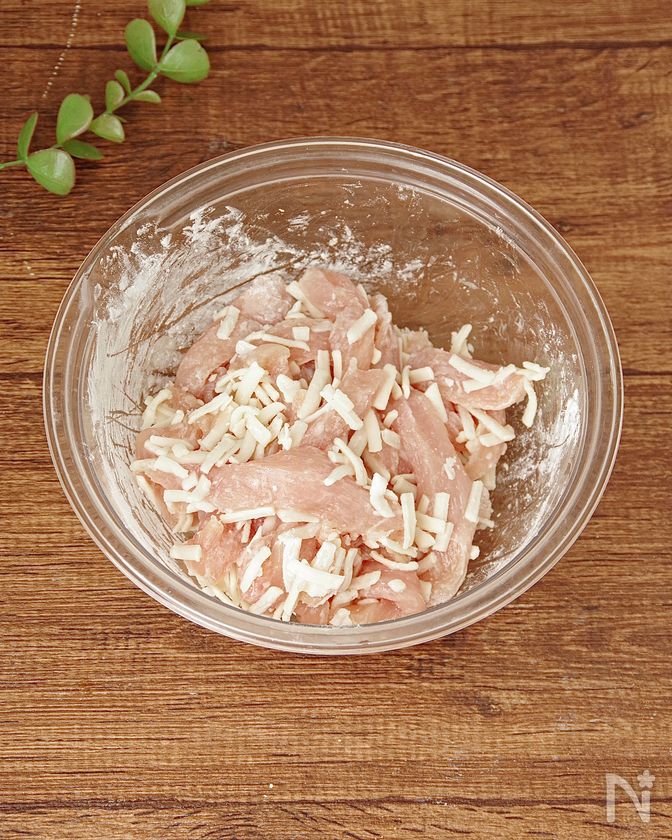 (2) ボウルに鶏むね肉を入れ、【A】を加えて揉み込んだら、片栗粉とピザ用チーズを加えて混ぜる。