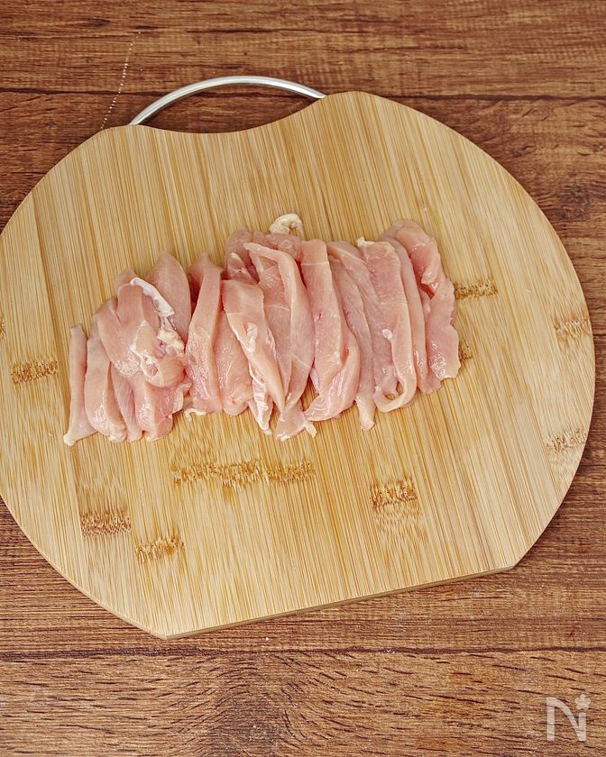 (1) 鶏むね肉は皮を取って1cm幅のそぎ切りにし、さらに1cm幅ほどの細切りにする。