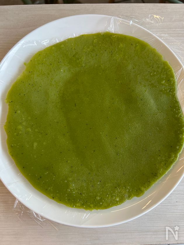(3) 2の生地の表面が乾いて焼けたら、フライ返しでフライパンから取り出し、ラップを敷いた器にのせ、粗熱を取る。