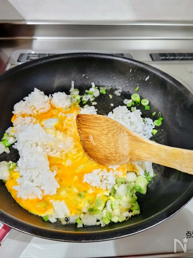 (2) フライパンに米油と青ネギを加えさっと炒めたら、ごはんと溶き卵を加え混ぜる。