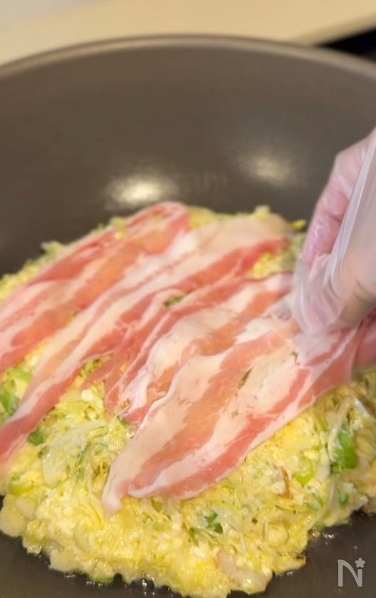 (3) サラダ油を中火で熱したフライパンに流し入れて形を整え、豚バラ肉で覆うように並べる。焼き色が付くまで焼く。