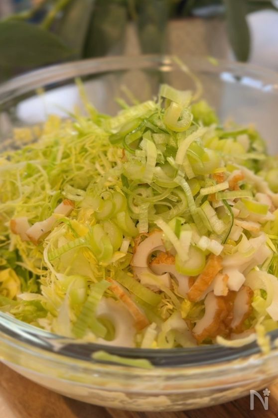 (2) キャベツ、ちくわ、ねぎを入れてざっくりと混ぜ合わせる。