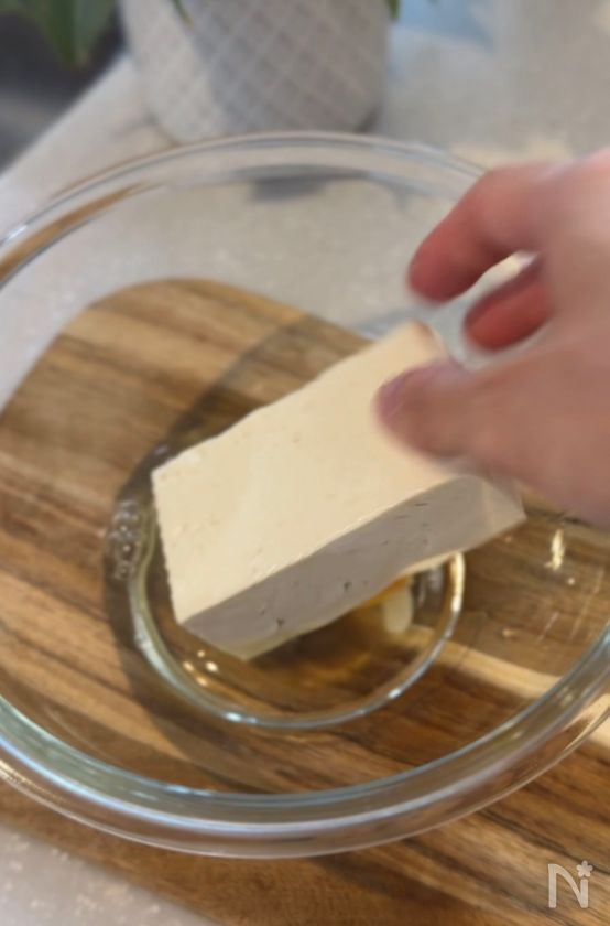 (1) ボウルに木綿豆腐と卵を入れて滑らかになるまで混ぜる。