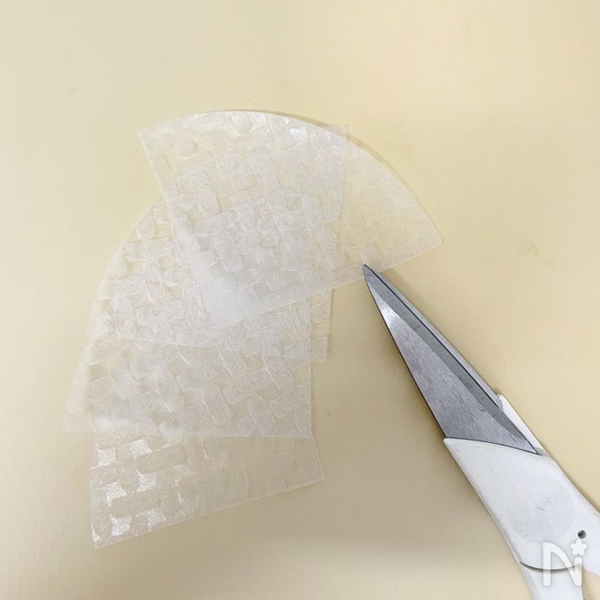 (1) ライスペーパー(直径15cm)は1/4にキッチンハサミで切る。(乾燥しないようにポリ袋などに入れておく)