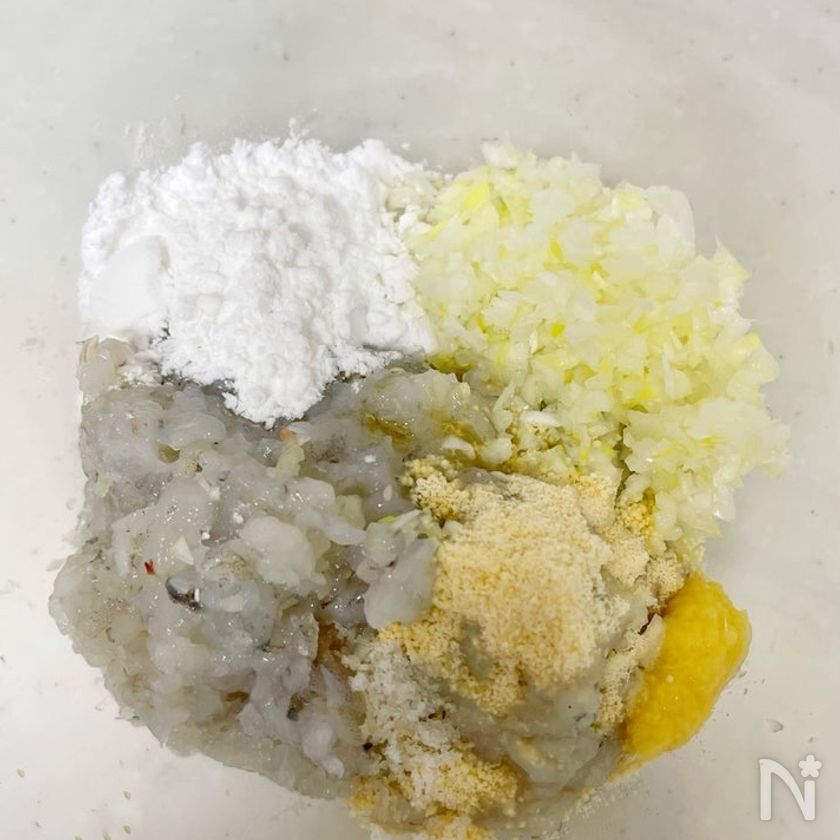 (5) 長ねぎ、むきえびと【A】をボウルに入れてよく混ぜる。