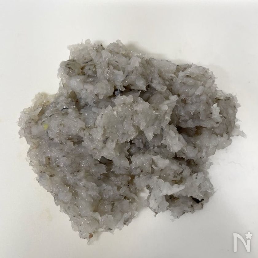 (4) むきえびを包丁でたたいて粗みじん切りにする。