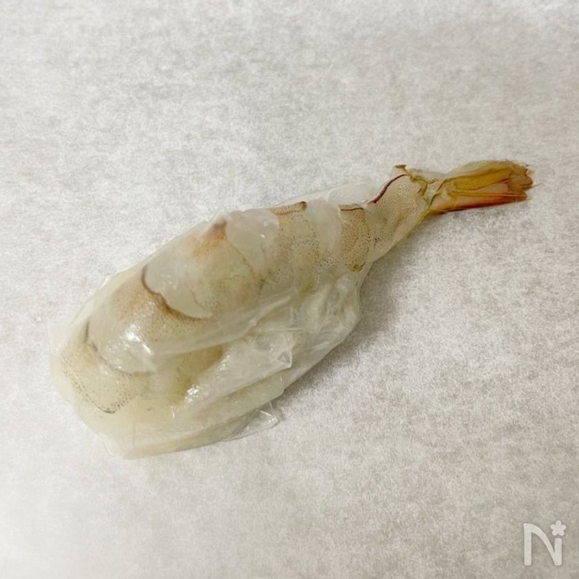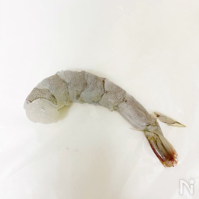 (2) 尾付えび(小〜中サイズ)は殻を尾の際まで剥き、背わたを取る。