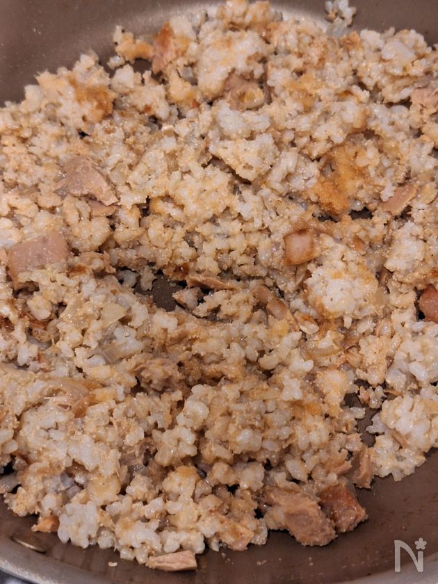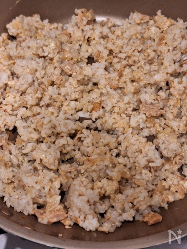 ・ツナ缶はオイルごと加えることでコクが増します。出来上がりがべたつかないよう、ごはんを入れる前に余分な水分を飛ばします。