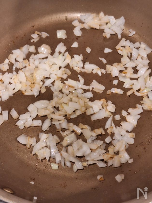 (2) フライパンにオリーブオイルを熱し、たまねぎを炒める。