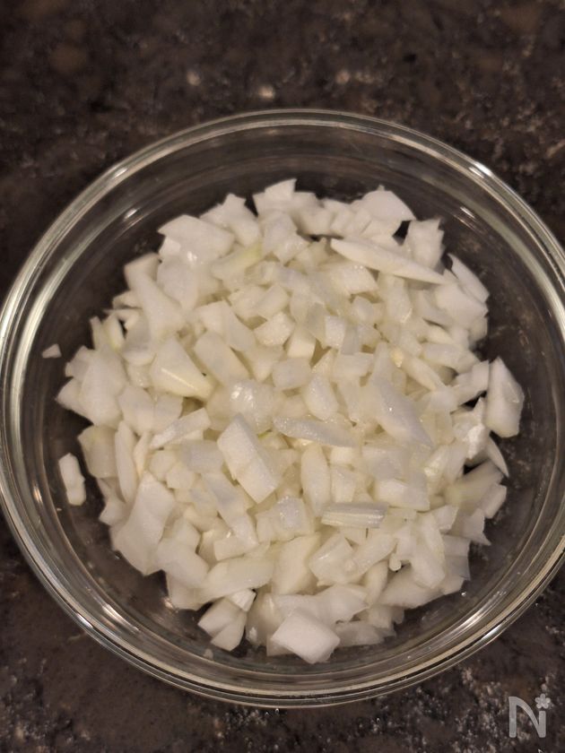 (1) たまねぎを粗みじん切りにする。