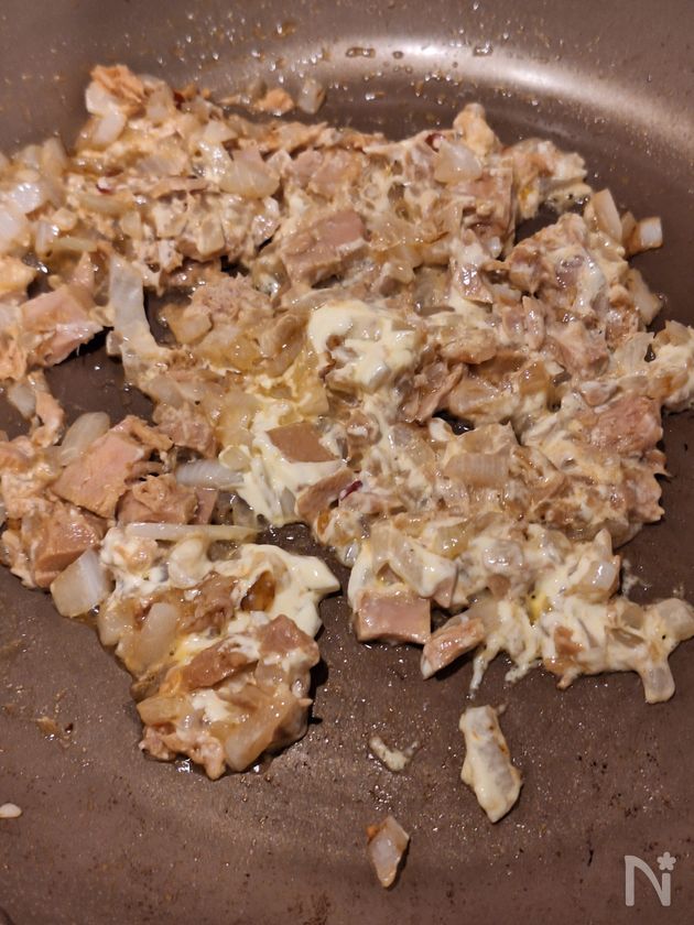 (3) たまねぎに透明感が出たら、【A】を加えて炒める。ツナ缶はオイルごと加える。