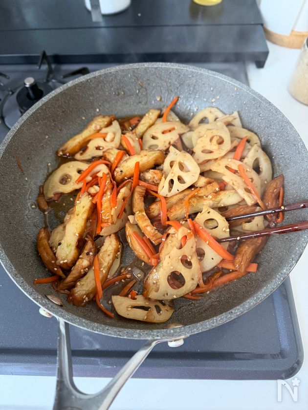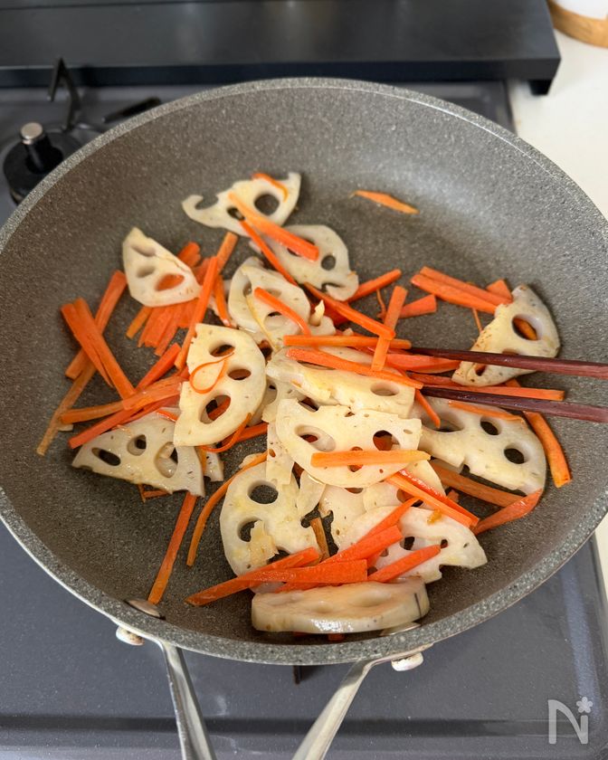 (2) フライパンにごま油をひき中火で熱し、れんこん、にんじんを入れて2分ほど炒める。