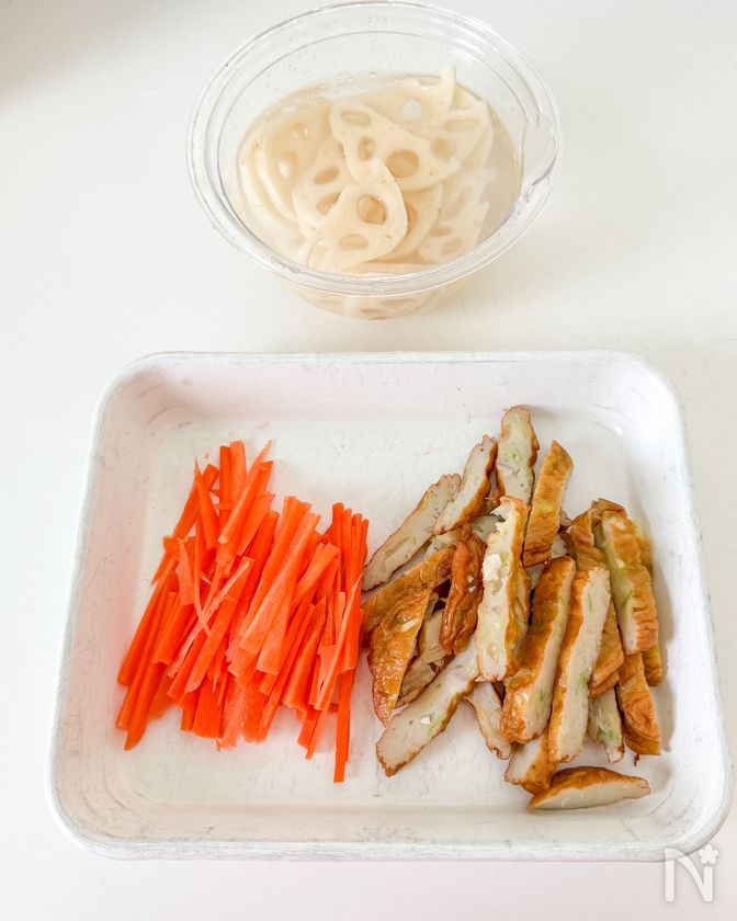 (1) れんこんは皮を剥いて5mm幅の半月切りにしたら、水に5分ほど晒し、水けをしっかりとペーパータオルで拭き取る。にんじん、さつま揚げは細切りにする。