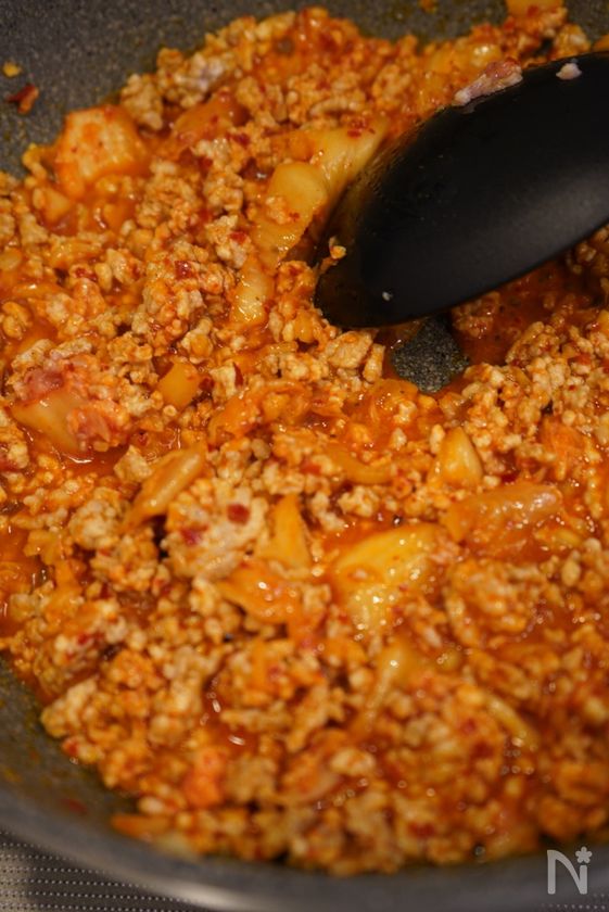 (2) 火が通ったらキムチを入れて炒め合わせる。