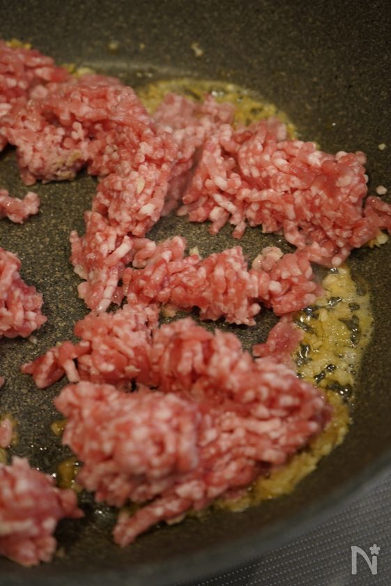 香りがしてきたら豚ひき肉を入れて塩、胡椒で炒める。