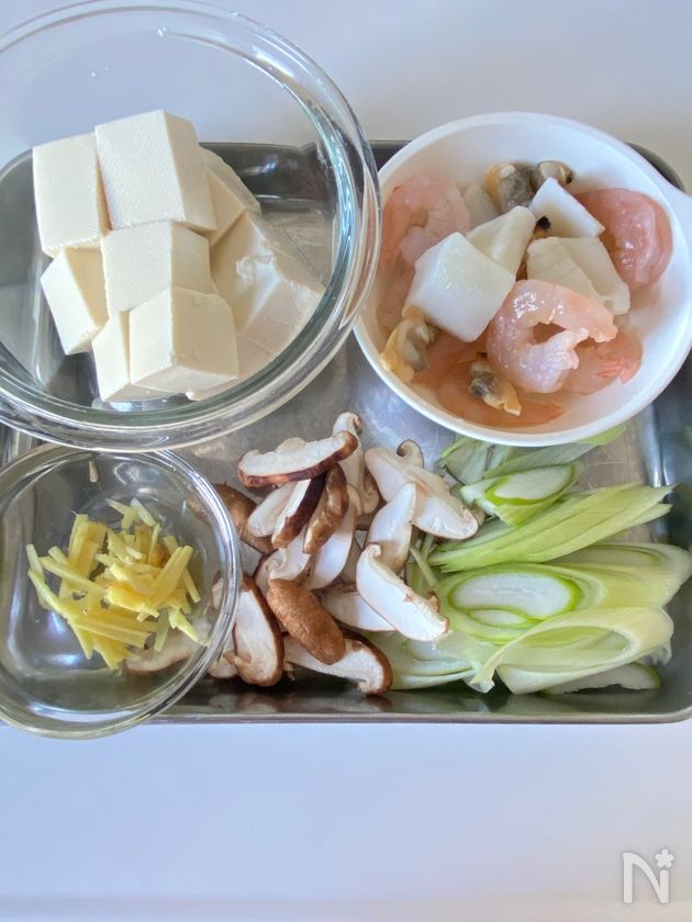 (2) 鍋にごま油をひき、中火でしょうがを入れて香りが出るまで炒めたら、シーフードミックス、しいたけ、豆板醤、コチュジャンを入れて炒める。